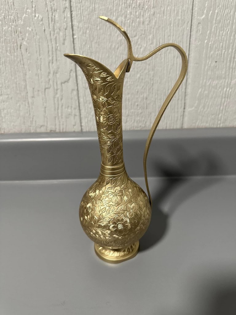 This brass ewer pitcher came in with heavy tarnish and oxidation that had built up over the years, leaving the surface dull and hiding much of the engraved detail. I vapor honed the piece to gently remove the oxidation and bring the brass back to a bright, even finish. The process cleaned the surface while preserving all of the original floral engraving and character of the piece.