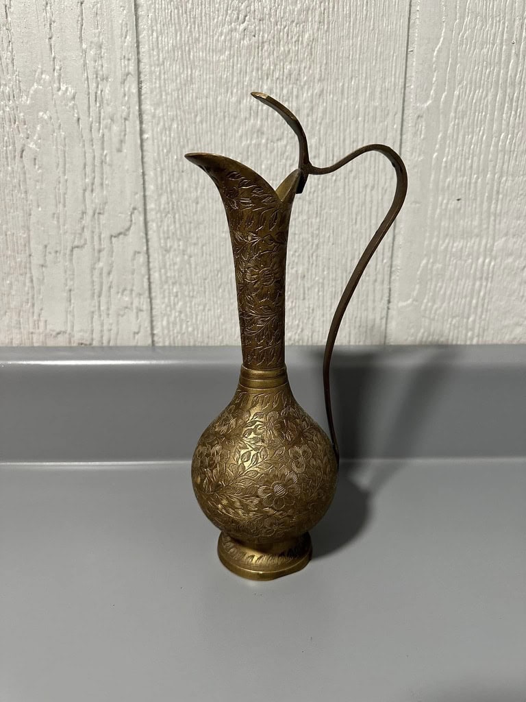 This brass ewer pitcher came in with heavy tarnish and oxidation that had built up over the years, leaving the surface dull and hiding much of the engraved detail. I vapor honed the piece to gently remove the oxidation and bring the brass back to a bright, even finish. The process cleaned the surface while preserving all of the original floral engraving and character of the piece.