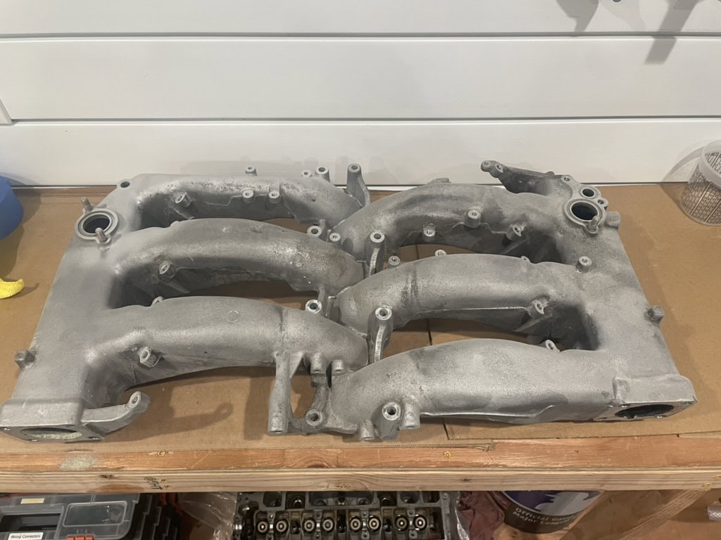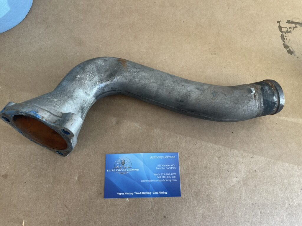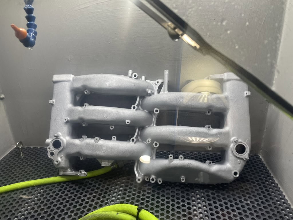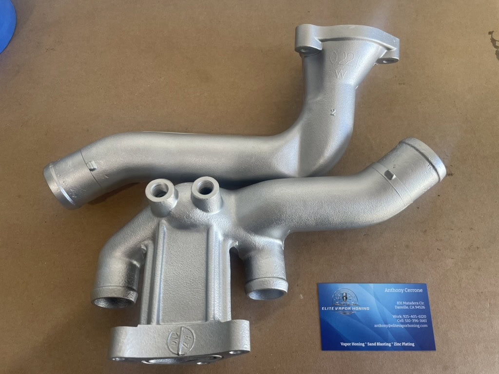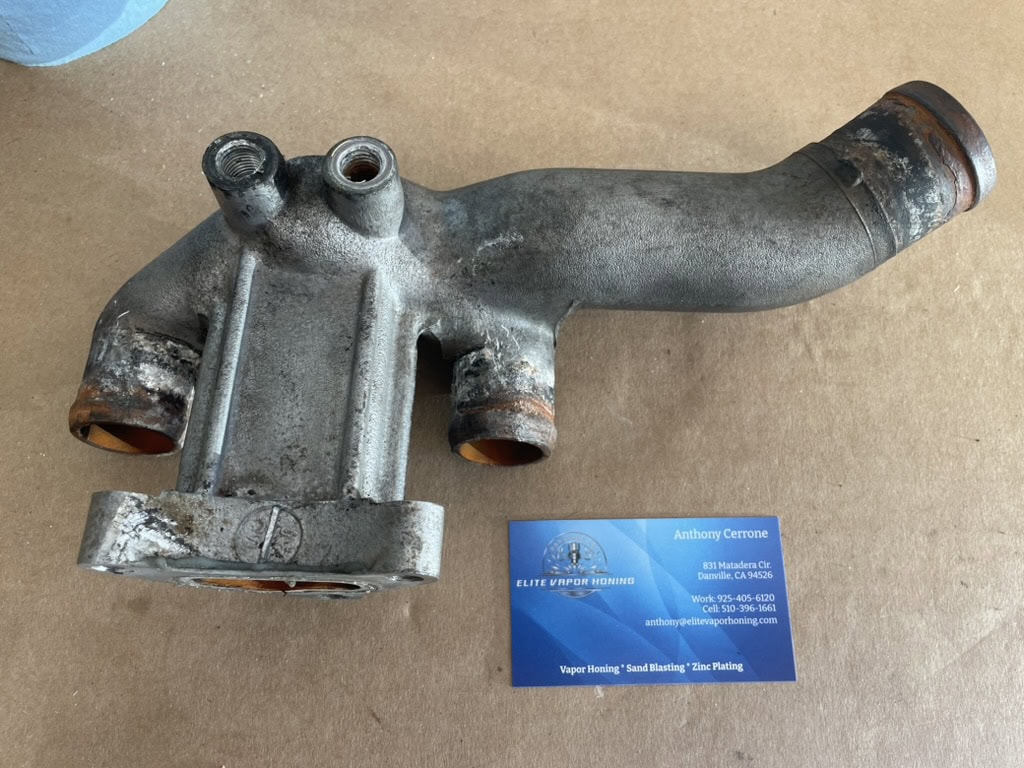 This intake manifold assembly and water outlet housing were cleaned and vapor honed to remove oxidation, staining, and buildup from the aluminum surfaces.
